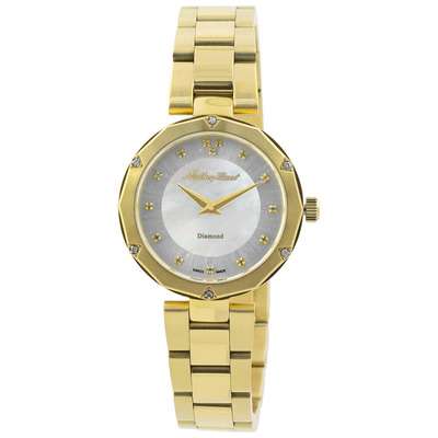 Yellow gold-tone stainless steel case bracelet fixed bezel mother of pearl dial yellow gold-tone hands diamond hour markers Analog Dial Type Ronda Caliber 762 quartz movement scratch resistant mineral crystal Pull Push crown Solid case back Round shape size 32mm Fold over clasp Water resistant up to 50 meters functions hour minute Molly Series Dress watch style Swiss Made