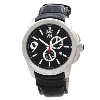 Jv1517 men's watch. Analog dial with luminous silver-tone hands and index hour markers including an Arabic numeral at 9 o'clock, minute markers around the outer rim, dual date function via sub-dials displaying seconds and date. Features a fixed stainless steel bezel, screw down crown, solid case back on a 43mm thick round stainless steel case. Equipped with a black leather strap, scratch resistant mineral crystal, quartz movement, water resistance to 100 meters / 330 feet.