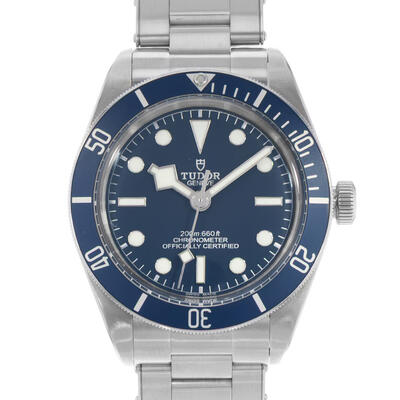 Pre-owned Tudor Black Bay Fifty-Eight Automatic Chronometer. Blue dial with silver-tone hands and index hour markers, minute outer ring markers. Silver-tone stainless steel case and bracelet. Unidirectional rotating blue bezel. Sapphire crystal glass is scratch resistant. Screw-down winding/crown. Solid case back. Analog display functions: hours/minutes/seconds shown via analog subdials or directly on the dial face with traditional indices and batons, features luminescent coating for visibility in low light conditions. Round 39 mm stainless steel bracelet watch movement type automatic self-winding powered by Tudor Calibre MT5402 mechanical movement containing 27 jewels beating at a frequency of 28800 vph (approximately 5 beats per second) offering an approximate power reserve of 70 hours. Water resistant up to 200 meters / 660 feet which makes it suitable for swimming and diving. Item Variations: 79030B, 79030b-0001.