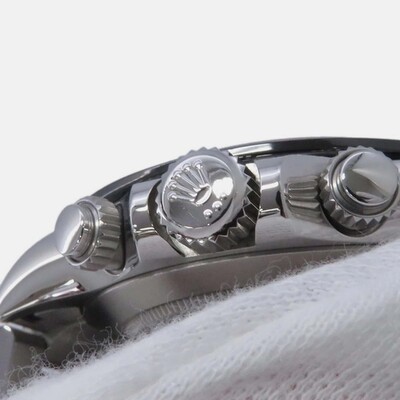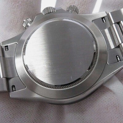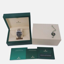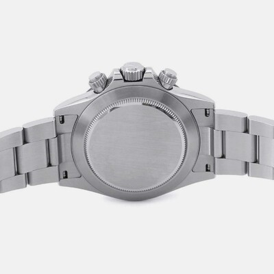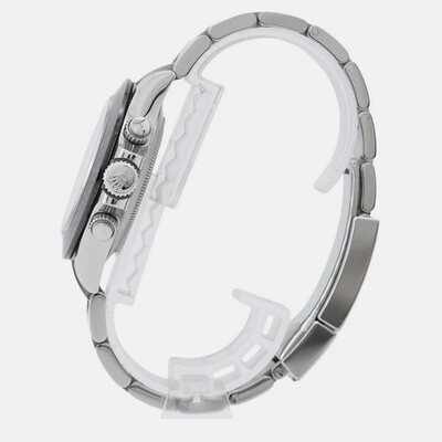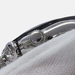 Automatic movement. Stainless steel case and bracelet. Solid fluted bezel. Black dial with luminous hands and Arabic numeral hour markers. Chromalight blue chronograph hand. Date display at 3 o'clock position. Screw-down winding/crown protector with logo pushers. Sapphire crystal glass. Clasp with folding tongue and safety lock. Blue ceramic insert tachymeter scale on fluted bezel (inner ring). Approximate case diameter: 40mm. Water resistant to 100 meters.