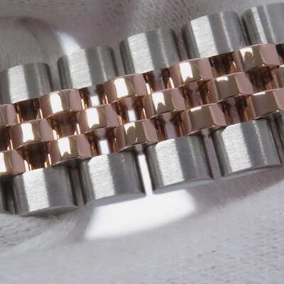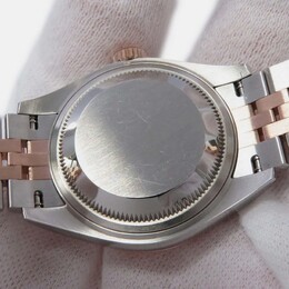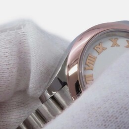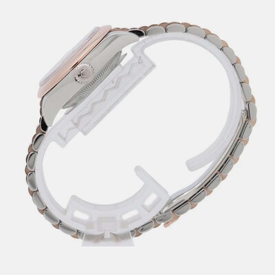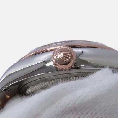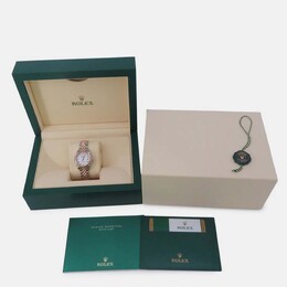 A women's automatic wristwatch with a white dial. Features an 18k rose gold and stainless steel case construction totaling approximately 28 mm in diameter. Includes the Cal. 3135 self-winding mechanical movement, providing smooth operation without needing battery changes for generations to come as it harnesses energy from motion. Comes equipped with luminous hands and baton indexes ensuring excellent legibility even under low light conditions by casting a faint glow on the dial surface. Secured by Rolex's Oysterclasp folding clasp system which is both robust against unintentional opening and easy to deploy for comfortable wear adjustment thanks to its integrated safety triangle mechanism preventing accidental release. The bezel features a classic polished finish, contributing to the overall timeless appearance of this sophisticated dress watch designed for everyday elegance.