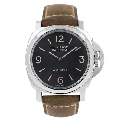 A pre-owned Swiss luxury mens' watch from Panerai. Features a black dial with retro luminous markers and hands, 44 mm steel case with brown leather strap, automatic mechanical movement (P.5000 caliber), small seconds sub-dial on the 12 o'clock side, sapphire crystal glass resistant to scratches, screw-down crown, fixed bezel, cushion shape design, water resistance up to 30 meters.
