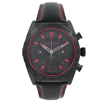 This pre-owned Tudor Fastrider Black Shield Chronograph boasts a sleek black ceramic case and strap combination, featuring an automatic movement with a tachymeter bezel, luminous elements, date display at the 4-5 o'clock position, three sub-dials for chronograph timing (seconds, minutes, hours), and sapphire crystal. The watch includes fixed black ceramic bezel, black dial accented by silver-tone hands and index hour markers, minute markers on the outer rim, screw-down crown, solid case back, 42mm round shape, water resistance up to 150 meters (500 feet).