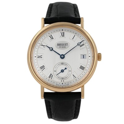 Pre-owned men's automatic watch with a silver dial, featuring Roman numeral and index hour markers, blue hands, yellow gold-tone case, black leather strap, round size 34.5mm, includes date display at the 3 o'clock position, solid case back, Swiss movement (Swiss Made), buckle clasp closure.