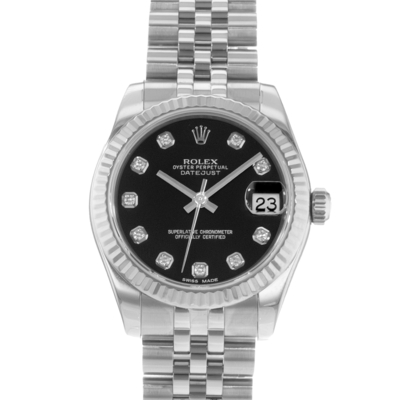 Silver-tone stainless steel case with a silver-tone stainless steel jubilee bracelet. Fixed 18kt white gold bezel. Black dial with silver-tone hands and diamond hour markers. Dial Type: Analog. Date display at the 3 o'clock position. Rolex Calibre 2235 Automatic movement, containing 31 Jewels, bitting at 28800 vph, and has a power reserve of approximately 48 hours. Scratch resistant sapphire crystal. Screw down crown. Solid case back. Round case shape, case size: 31 mm. Fold over clasp with a safety release. Water resistant at 100 meters / 330 feet. Functions: date, hour, minute, second, chronometer. Datejust 31 Series. Luxury watch style. Watch label: Swiss Made. Item Variations: 178274, 178274-BKDJ, Rolex-178274, Rolex-178274-BKDJ. Pre-owned Rolex Datejust 31 Automatic Chronometer Diamond Black Dial Ladies Watch 178274 BKDJ.