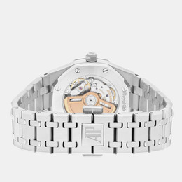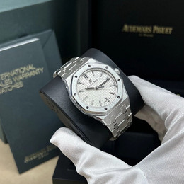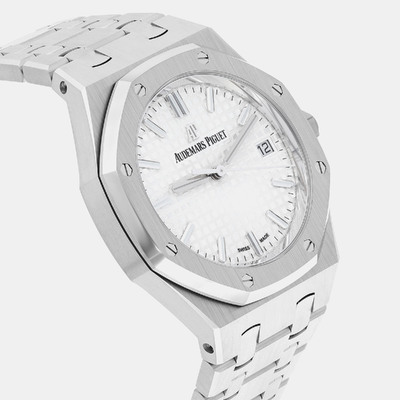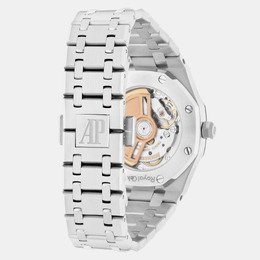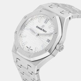 This Audemars Piguet Royal Oak features a 34mm stainless steel case with a matching bracelet and a bright silver tone dial. Its automatic movement offers dependable precision, while the signature octagonal bezel completes the classic Royal Oak design. A versatile women’s watch suited for daily wear.