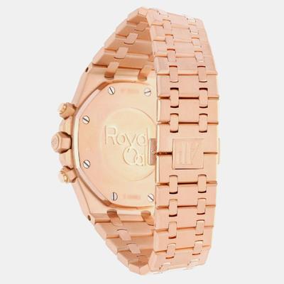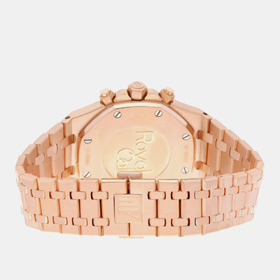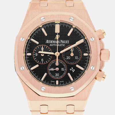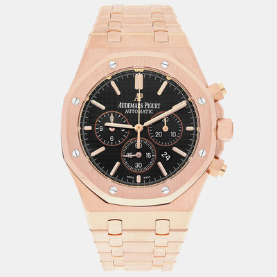 Built from solid 18k rose gold, this 41mm Royal Oak showcases a striking contrast between its black dial and warm toned case. The automatic movement powers chronograph functions with precision and ease. A strong addition to any men’s luxury watch collection.