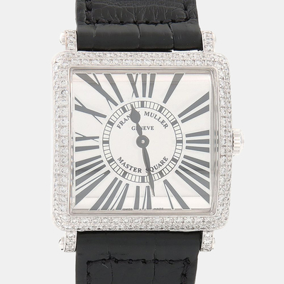 The Franck Muller Master Square 6002MQZD showcases a 32mm gold case set with white diamonds. The square dial features clear numerals and a quartz movement for dependable accuracy. This women’s watch stands out with its geometric charm and elegant detailing.