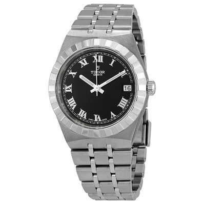 Pre-owned 316L steel case with a 316L steel bracelet. Fixed 316L steel bezel. Black dial with luminous silver-tone hands and Roman numeral hour markers. Minute markers around the outer rim. Dial Type: Analog. Luminescent hands. Date display at the 3 o'clock position. Tudor calibre T601 automatic movement, based upon ETA 2824, containing 25 Jewels, bitting at 28800 vph, and has a power reserve of approximately 38 hours. Scratch resistant sapphire crystal. Screw down crown. Solid case back. Round case shape. Case size: 34 mm. Fold over clasp with a safety release. Water resistant at 100 meters / 330 feet. Functions: date, hour, minute, second. Royal Series. Luxury watch style. Watch label: Swiss Made. Tudor Royal Automatic Black Dial Ladies Watch M28400-0003.