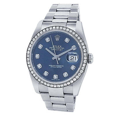 Silver-tone stainless steel case with a silver-tone stainless steel oyster bracelet. Fixed silver-tone bezel with diamond set stainless steel. Blue dial with silver-tone hands and diamond hour markers. Dial Type: Analog. Date display at the 3 o'clock position. Rolex Calibre 3135 Automatic movement, containing 31 Jewels, bitting at 28800 vph, and has a power reserve of approximately 48 hours. Scratch resistant sapphire crystal. Screw down crown. Solid case back. Round case shape, case size: 36 mm. Fold over clasp with a safety release. Water resistant at 100 meters / 330 feet. Functions: date, hour, minute, second, chronometer. Datejust Series. Casual watch style. Watch label: Swiss Made. Pre-owned Rolex Datejust Automatic Chronometer Diamond Blue Dial Mens Watch 116244 BLDO.