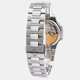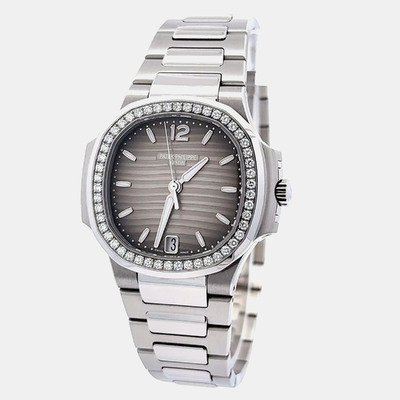The Patek Philippe Nautilus 7018/1A 011 is a women’s automatic watch crafted in stainless steel with a 34 mm case. Its grey dial features applied hour markers and a date display for daily convenience. Powered by a self winding movement, this model combines reliable performance with Patek Philippe’s signature craftsmanship.