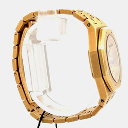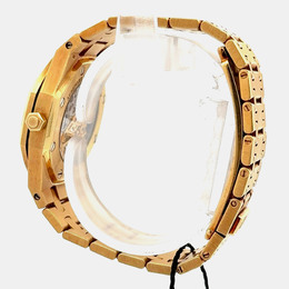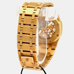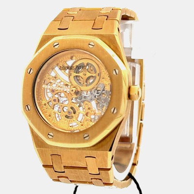 The Audemars Piguet Royal Oak 14794BA.OO.0902BA.99 showcases a detailed skeleton dial within a 30 mm 18K yellow gold case. Its automatic movement is visible through the openwork design, reflecting the brand’s precision and artistry. A gold bracelet completes the elegant construction.