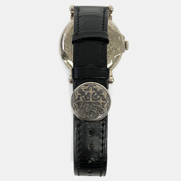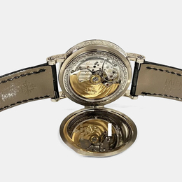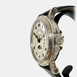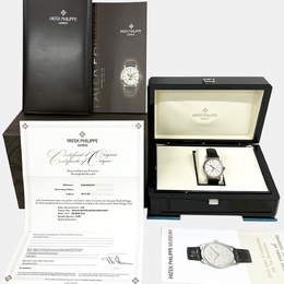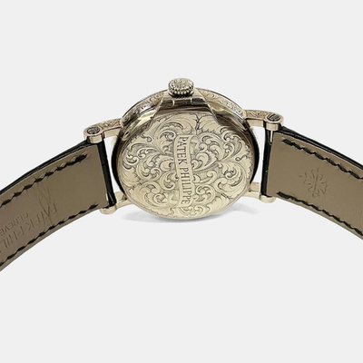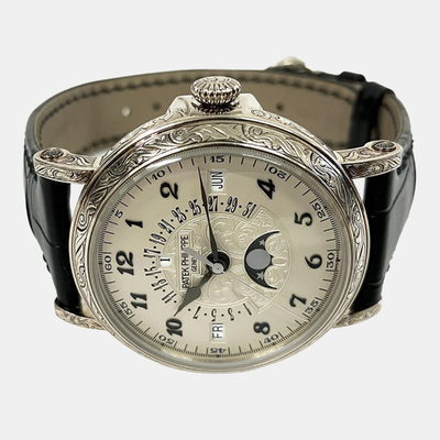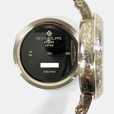 The Patek Philippe 5160/500G 001 is a remarkable perpetual calendar watch featuring an intricate hand engraved 18k white gold case. Its automatic movement powers a precise calendar mechanism with moon phase display. Measuring 42 mm, this model embodies Patek’s mastery of both design and mechanical complexity.