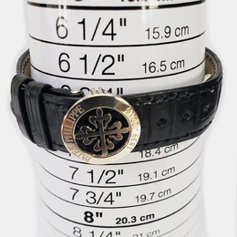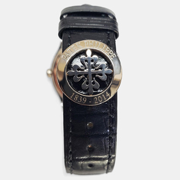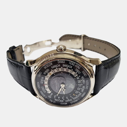 The Patek Philippe World Time 5575G 001 offers a world time complication in a 39.5 mm 18k white gold case. Its black dial displays global time zones with clarity, powered by an automatic movement known for precision and craftsmanship.