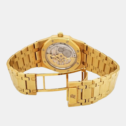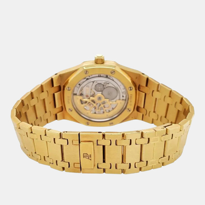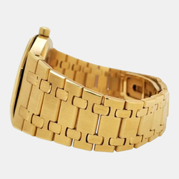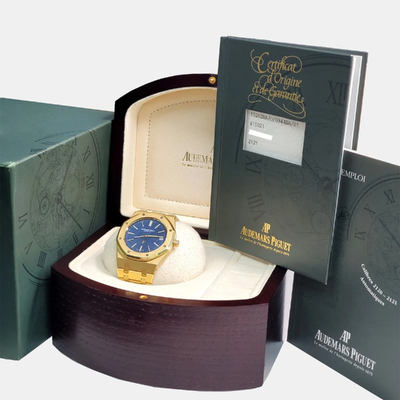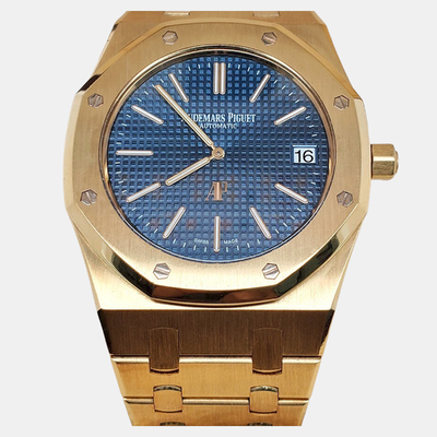 The Audemars Piguet Royal Oak 15202BA pairs its 18k yellow gold case with a blue “Petite Tapisserie” dial for a striking contrast. Powered by an ultra thin automatic movement, this 39 mm men’s watch reflects the design codes of the original 1972 Royal Oak while offering modern reliability.