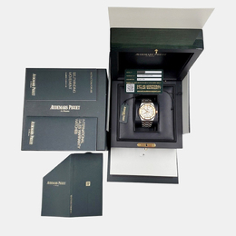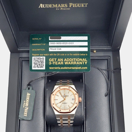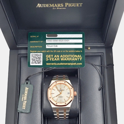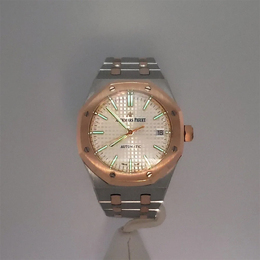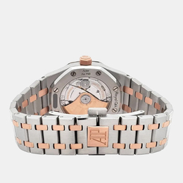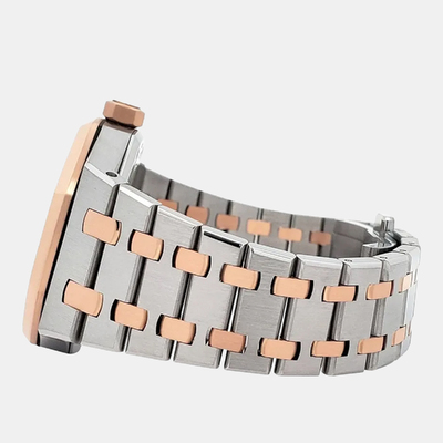 The Royal Oak 15450SR blends 18k rose gold and stainless steel for a balanced two tone design. Powered by an automatic movement, the 37 mm case and silver patterned dial maintain the instantly recognizable Royal Oak look with a modern touch.