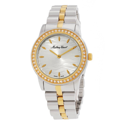 D10860BQYS Mathey-Tissot ladies' watch, featuring a stainless steel case with two-tone (silver and yellow gold PVD) bracelet. Equipped with a fixed bezel set in yellow gold PVD and accented by zirconia crystals. Silver analog dial displays hours and minutes marked with index hour markers and yellow gold-tone hands. Powered by Ronda 1062 quartz movement, protected by scratch-resistant mineral crystal; includes push/pull crown, solid case back, and round 32 mm case shape. Butterfly clasp closure, water resistance up to 50 meters (165 feet).