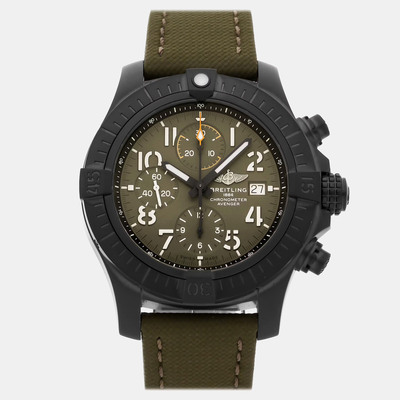 Built for strength and precision, the Pre Owned Breitling Avenger Chronograph 45mm commands attention with its khaki green dial framed by a black DLC coated titanium case. Powered by an automatic movement, it delivers flawless chronograph performance and everyday functionality. Paired with a matching green military strap, this authentic Breitling embodies bold style and rugged endurance.