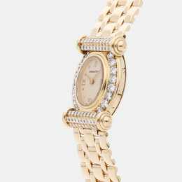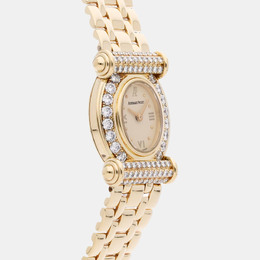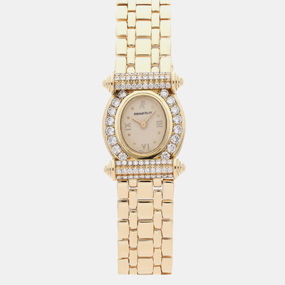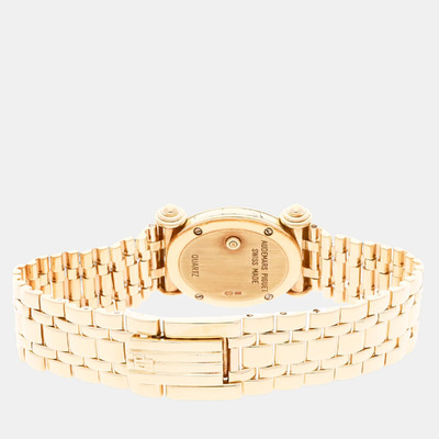 Elegant and luxurious, the Pre Owned Audemars Piguet 20mm Diamond Womens Watch features an ivory dial framed by a full diamond set 18k yellow gold bezel. Powered by quartz movement, it is paired with a matching gold bracelet, offering timeless style and authentic craftsmanship.