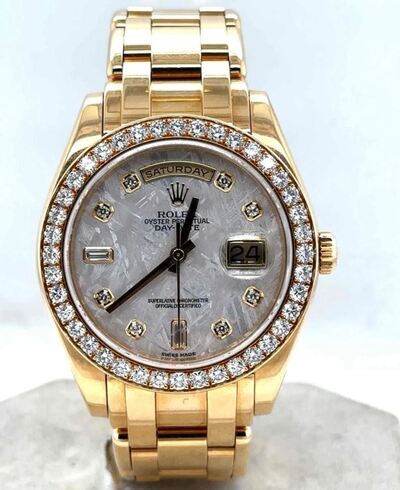 Yellow gold-tone 18kt yellow gold case with a yellow gold-tone 18kt yellow gold pearlmaster bracelet. Fixed yellow gold-tone bezel with diamond set 18kt yellow gold. Meteorite dial with yellow gold-tone hands and diamond hour markers. Dial Type: Analog. Date display at the 3 o'clock position and day display at the 12 o'clock position. Rolex Calibre 3155 Automatic movement, based upon Rolex 3055, containing 31 Jewels, bitting at 28800 vph, and has a power reserve of approximately 48 hours. Scratch resistant sapphire crystal. Screw down crown. Solid case back. Round case shape, case size: 39 mm. Crown clasp. Water resistant at 100 meters / 330 feet. Functions: date, day, hour, minute, second, chronometer. Additional Info: fits up to 7.25 inch wristweighs: 201.8 grams. Day-date Series. Casual watch style. Watch label: Swiss Made. Pre-owned Rolex Day-Date Automatic Chronometer Diamond Ladies Watch 18948MTDO.