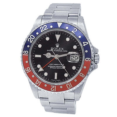 Silver-tone stainless steel case with a silver-tone stainless steel oyster bracelet. Bi-directional rotating stainless steel bezel. Black dial with silver-tone hands and index hour markers. Minute markers around the outer rim. Dial Type: Analog. Luminescent hands and markers. Date display at the 3 o'clock position. Automatic movement. Screw down crown. Solid case back. Round case shape, case size: 40 mm. Fold over clasp with a safety release. Functions: date, hour, minute, second. Gmt-master II Pepsi Series. Sport watch style. Watch label: Swiss Made. Pre-owned Rolex GMT-Master II Pepsi Automatic Black Dial Mens Watch 16710 BKSO.