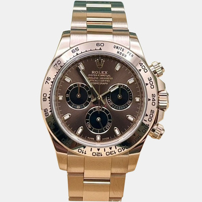This pre owned Rolex Daytona 116505 presents a warm chocolate dial within a 40mm 18K rose gold case. The automatic chronograph ensures reliable performance, while the watch maintains verified authenticity and a refined, classic presence on the wrist.
