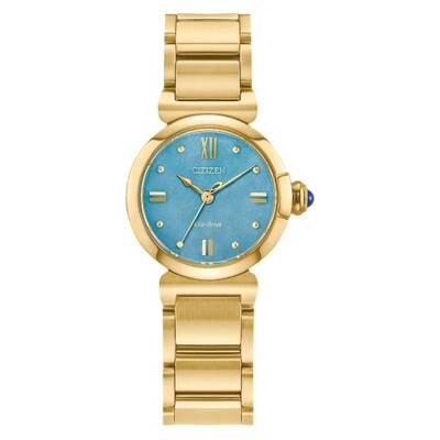 Light gold-tone stainless steel case and bracelet. Fixed light gold-tone stainless steel bezel. Light blue dial with gold-tone hands and index hour markers. Dial Type: Analog. Citizen Caliber Eco-Drive E031 eco-drive movement. Scratch resistant sapphire crystal. Pull / push crown. Solid case back. Round case shape, case size: 26 mm. Deployment clasp. Water resistant at 50 meters / 165 feet. Functions: hour, minute, second, solar-powered. L Mae Series. Dress watch style. Watch label: Japan Movt. Citizen Limited Edition L Mae Eco-Drive Ladies Watch EM1133-85L.