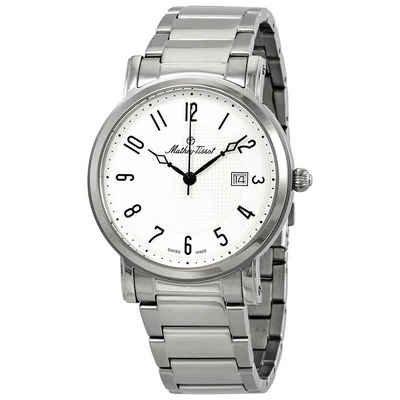 Stainless steel case with a stainless steel bracelet and fixed bezel. White dial features black hour/minute hands, Arabic numeral markers, minute marks on the outer rim, analog display type, date window at 3 o'clock position powered by Ronda caliber 505 quartz movement. Equipped with scratch resistant sapphire crystal glass, pull/push crown, solid case back, and round shape measuring 42 mm in diameter and 5 mm thick. Includes fold over clasp with push button release mechanism for easy adjustment; water resistant up to 50 meters / 165 feet depth. Functions are hour, minute, second, date display. Belongs to the City Metal Series. This is a casual style watch.