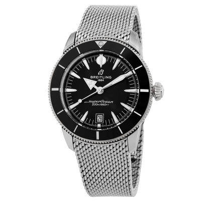 Silver-tone stainless steel case and bracelet. Uni-directional rotating black stainless steel bezel. Black dial with silver-tone hands and index hour markers. Minute markers around the outer rim. Dial Type: Analog. Luminescent hands and markers. Date display at the 6 o'clock position. Breitling Calibre 31 automatic movement. Scratch resistant sapphire crystal. Screw down crown. Transparent see through case back. Round case shape, case size: 40 mm. Fold over clasp with a safety release. Water resistant at 200 meters / 660 feet. Functions: date, hour, minute, second. Superocean Heritage Series. Luxury watch style. Watch label: Swiss Made. Breitling Superocean Heritage Automatic Black Dial Mens Watch AB3110241B1A1.