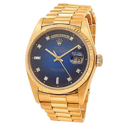 Yellow gold-tone 18kt yellow gold case with a yellow gold-tone 18kt yellow gold president bracelet. Fixed yellow gold-tone 18kt yellow gold bezel. Blue dial with yellow gold-tone hands and diamond hour markers. Minute markers around the outer rim. Dial Type: Analog. Date display at the 3 o'clock position. Rolex Calibre 3055 Automatic movement, containing 37 Jewels, bitting at 28800 vph, and has a power reserve of approximately 42 hours. Screw down crown. Solid case back. Round case shape, case size: 36 mm. Crown clasp. Functions: date, day, hour, minute, second, chronometer. Day Date Series. Dress watch style. Watch label: Swiss Made. Pre-owned Rolex Day Date Automatic Chronometer Diamond Blue Dial Mens Watch 18038 BLDP.