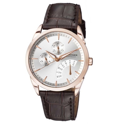 Men's watch from Rudiger Hamelin. Features a rose gold-tone stainless steel case and brown leather strap. Includes fixed rose gold-tone bezel, silver dial with rose gold-tone hands and index hour markers. Minute markers present around the outer rim. Analog dial type equipped with three subdials displaying 24 hours, day, and date functions. Powered by a quartz movement mechanism. Equipped with scratch-resistant mineral crystal lens. Features push/pull crown control and solid case back. Classic round case shape measures 39 mm in diameter and has a thickness of 9.5 mm. The band width is 21 mm and adjustable length reaches approximately 8.5 inches (using buckle clasp). Water resistant up to 50 meters / 165 feet depth. Functions include displaying hours, minutes, seconds, date, and day of the week analog style watch.