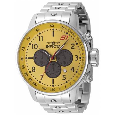 Silver-tone stainless steel case and bracelet. Fixed silver-tone stainless steel bezel. Yellow and grey dial with black hands and Arabic numeral hour markers. Tachymeter scale around the outer rim. Dial Type: Analog. Luminescent hands. Date display between 4 and 5 o'clock position. Chronograph - three sub-dials displaying: 60 second, 60 minute and 24 hour. Hattori Caliber VD53 quartz movement. Scratch resistant mineral crystal. Pull / push crown. Solid case back. Round case shape, case size: 48 mm, case thickness: 13.5 mm. Band width: 22 mm, band length: 8.25 inches. Fold over safety clasp. Water resistant at 100 meters / 330 feet. Functions: chronograph, date, GMT, second time zone, hour, minute, second. S1 Rally Series. Sport watch style. Watch label: Japan Movt. Invicta S1 Rally Chronograph GMT Quartz Mens Watch 23085.