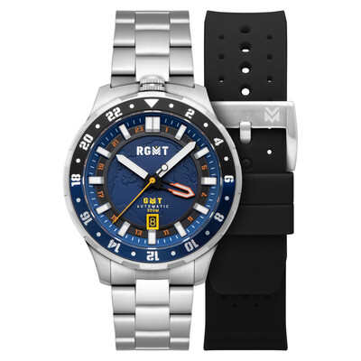 Silver-tone stainless steel case and bracelet. Uni-directional rotating blue stainless steel bezel. Blue dial with silver-tone hands and index hour markers. Minute markers around the outer rim. Dial Type: Analog. Luminescent hands and markers. Date display at the 6 o'clock position. SII-NH34 automatic movement. Scratch resistant sapphire crystal. Pull / push crown. Transparent case back. Round case shape, case size: 46 mm, case thickness: 16 mm. Band width: 22 mm, band length: 8 inches. Fold over clasp with a safety release. Water resistant at 300 meters / 1000 feet. Functions: date, hour, minute, second. Globemaster Series. Casual watch style. Watch label: Japan Movement. RGMT Globemaster Automatic Blue Dial Mens Watch RG-8067-44.