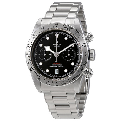 Pre-owned Silver-tone stainless steel case with a silver-tone stainless steel bracelet. Fixed silver-tone stainless steel showing tachymeter markings bezel. Black dial with luminous silver-tone snowflake shape hands and dot hour markers. Minute markers around the outer rim. Dial Type: Analog. Luminescent hands and markers. Date display at the 6 o'clock position. Chronograph - two sub-dials displaying: 60 seconds, and 45 minutes. Tudor Calibre MT5813 Automatic movement, based upon Breitling B01, containing 47 Jewels, bitting at 28800 vph, and has a power reserve of approximately 70 hours. Scratch resistant sapphire crystal. Screw down crown. Solid case back. Round case shape, case size: 41 mm. Band width: 22 mm. Fold over with push button release clasp. Water resistant at 200 meters / 660 feet. Functions: chronograph, date, hour, minute, second, chronometer. Heritage Black Bay Chrono Series. Casual watch style. Watch label: Swiss Made. Tudor Heritage Black Bay Chrono Chronograph Automatic Chronometer Black Dial Mens Watch M79350-0004.