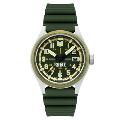 Silver-tone composite case with a green silicone strap. Fixed green stainless steel bezel. Green dial with silver-tone hands and index hour markers. Minute markers around the outer rim. Dial Type: Analog. Luminescent hands and markers. Date display at the 3 o'clock position. SII-NH35 automatic movement. Scratch resistant sapphire crystal. Pull / push crown. Solid case back. Round case shape, case size: 43 mm, case thickness: 13 mm. Band width: 22 mm, band length: 8 inches. Water resistant at 300 meters / 1000 feet. Functions: date, hour, minute, second. Defender Series. Casual watch style. Watch label: Japan Movement. RGMT Defender Automatic Green Dial Mens Watch RG-8069-05.