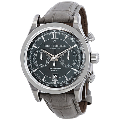 Silver-tone stainless steel case with a grey (louisiana alligator) leather strap. Fixed silver-tone stainless steel bezel. Bluish grey dial with silver-tone skeleton hands and index hour markers. Minute markers. Tachymeter markings around the outer rim. Dial Type: Analog. Date display at the 6 o'clock position. Chronograph - two sub-dials displaying: 60 second and 30 minute. Carl F. Bucherer Calibre CFB 1970 Automatic movement, based upon ETA 7750, containing 25 Jewels, bitting at 28800 vph, and has a power reserve of approximately 42 hours. Scratch resistant sapphire crystal. Round case shape, case size: 43 mm, case thickness: 14.45 mm. Band width: 22 mm. Fold over buckle clasp. Water resistant at 30 meters / 100 feet. Functions: chronograph, tachymeter, date, hour, minute, second, flyback. Manero Flyback Series. Luxury watch style. Watch label: Swiss Made. Pre-owned Carl F. Bucherer Manero Flyback Chronograph Automatic Mens Watch 00.10919.08.93.01.