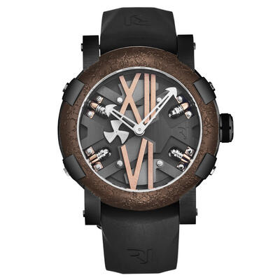 Stainless steel case with a black rubber strap. Fixed brown stainless steel bezel. Grey dial with silver-tone hands. Dial Type: Analog. Luminescent hands. RJ2901 Mechanical self-winding movement, 28'800 vph automatic movement. Scratch resistant sapphire crystal. Pull / push crown. Solid case back. Round case shape, case size: 46 mm, case thickness: 14.5 mm. Band width: 22 mm, band length: 8 inches. Fold over clasp with a safety release. Water resistant at 30 meters / 100 feet. Functions: hour, minute. Steampunk Series. Luxury watch style. Romain Jerome Steampunk Grey Dial Mens Watch RJ.ST.AU.403.20.