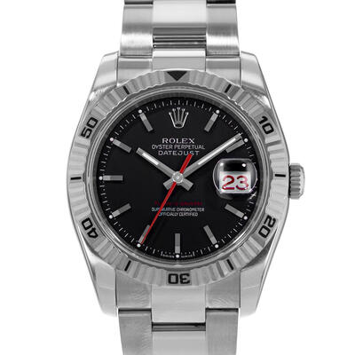 Silver-tone stainless steel case, silver-tone stainless steel oyster bracelet, 18kt white gold bezel, black dial, silver-tone hands, luminous markers, minute markers, analog dial, date display at 3 o'clock, Rolex Calibre 3135 automatic movement, 31 jewels, 28800 vph, 48-hour power reserve, sapphire crystal, screw-down crown, solid caseback, round shape, 36mm case size, fold-over clasp with safety release, 100m water resistance, date, hour, minute, second, chronometer functions, Datejust Series, luxury watch style, Swiss Made