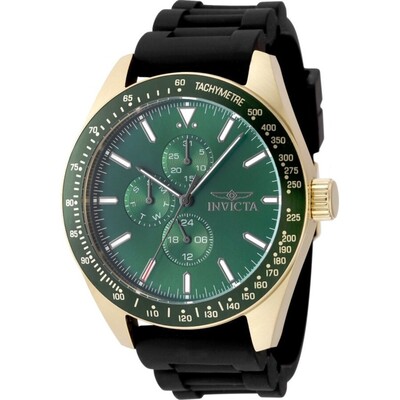 Gold-tone stainless steel case with a black silicone strap. Fixed two-tone (green and gold) aluminum bezel. Green dial with silver-tone hands and index hour markers. Minute markers around the outer rim. Dial Type: Analog. Luminescent hands and markers. Date display at the 12 o'clock position. Three sub-dials displaying: date, day and 24 hour. TMI Caliber VH67 quartz movement. Scratch resistant Flame Fusion crystal. Pull / push crown. Solid case back. Round case shape, case size: 45 mm, case thickness: 12.00 mm. Band width: 22 mm, band length: 8.25 inches. Buckle clasp. Water resistant at 100 meters / 330 feet. Functions: date, day, second time zone, hour, minute, second. Aviator Series. Casual watch style. Watch label: Japan Movt. Invicta Aviator Quartz Green Dial Mens Watch 49077.