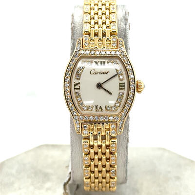 Yellow gold-tone 18kt yellow gold case and bracelet. Fixed yellow gold-tone bezel with diamond set 18kt yellow gold. Beige dial with yellow gold-tone hands and diamond hour markers. Dial Type: Analog. Quartz movement. Scratch resistant sapphire crystal. Pull / push crown. Solid case back. Unique case shape, case size: 20 mm, case thickness: 6 mm. Band width: 9 mm. Hidden clasp. Water resistant at 30 meters / 100 feet. Functions: hour, minute. Tortue Series. Luxury watch style. Watch label: Swiss Made. Pre-owned Cartier Tortue Diamond Beige Dial Ladies Watch.
