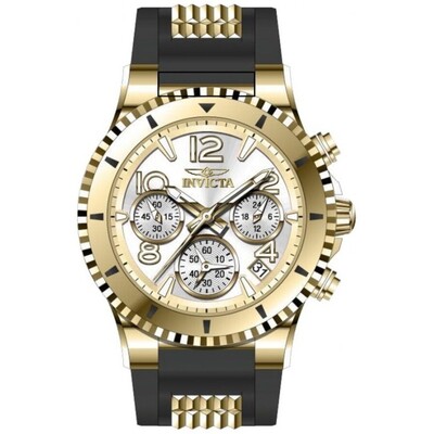 Gold-tone stainless steel case with a two-tone (black and gold) silicone and stainless steel strap. Fixed two-tone (gold and black) aluminum and stainless steel bezel. Silver-tone dial with gold-tone hands and index-Arabic numeral hour markers. Minute markers around the outer rim. Dial Type: Analog. Luminescent hands and markers. Date display between 4 and 5 o'clock position. Chronograph - three sub-dials displaying: 60 second, 60 minute and 24 hour. Hattori Caliber VD53 quartz movement. Scratch resistant Flame Fusion crystal. Pull / push crown. Solid case back. Round case shape, case size: 39 mm, case thickness: 11.70 mm. Band width: 22 mm, band length: 8.25 inches. Buckle clasp. Water resistant at 100 meters / 330 feet. Functions: chronograph, date, GMT, second time zone, hour, minute, second. Blu Series. Sport watch style. Watch label: Japan Movt. Invicta Blu Chronograph GMT Quartz Silver Dial Ladies Watch 49804.