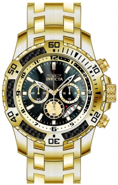 Gold-tone stainless steel case and bracelet. Two-tone (gold and black) carbon fiber and stainless steel bezel. Black dial with gold-tone hands and Arabic numeral hour markers. Minute markers around the outer rim. Dial Type: Analog. Luminescent hands and markers. Date display between 4 and 5 o'clock position. Chronograph - three sub-dials displaying: 60 second, 60 minute and 24 hour. Hattori Caliber VD53 quartz movement. Scratch resistant Flame Fusion crystal. Pull / push crown. Solid case back. Round case shape, case size: 51 mm, case thickness: 17.70 mm. Band width: 26 mm, band length: 7.75 inches. Fold over safety clasp. Water resistant at 100 meters / 330 feet. Functions: chronograph, date, GMT, second time zone, hour, minute, second. Pro Diver Series. Sport watch style. Watch label: Japan Movt. Invicta Pro Diver SCUBA Chronograph GMT Quartz Black Dial Mens Watch 49854.