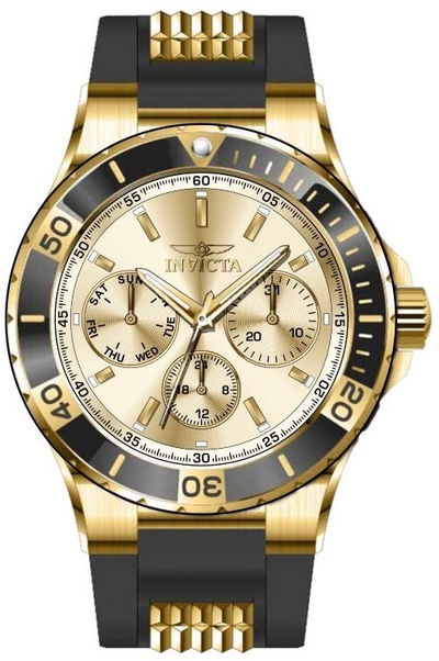 Gold-tone stainless steel case with a two-tone (black and gold) silicone and stainless steel strap. Uni-directional rotating two-tone (gold and black) aluminum and stainless steel bezel. Gold-tone dial with gold-tone hands and index hour markers. Minute markers around the outer rim. Dial Type: Analog. Luminescent hands and markers. Date display at the 3 o'clock position. Three sub-dials displaying: date, day and 24 hour. TMI Caliber VH63 quartz movement. Scratch resistant Flame Fusion crystal. Pull / push crown. Solid case back. Round case shape, case size: 38 mm, case thickness: 11.70 mm. Band width: 22 mm, band length: 7.75 inches. Buckle clasp. Water resistant at 100 meters / 330 feet. Functions: date, day, second time zone, hour, minute, second. Aviator Series. Casual watch style. Watch label: Japan Movt. Invicta Aviator Quartz Gold Dial Ladies Watch 49892.