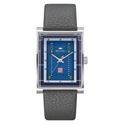 Silver-tone stainless steel case with a grey leather strap. Fixed silver-tone stainless steel bezel. Blue dial with silver-tone hands and index hour markers. Dial Type: Analog. Quartz movement. Scratch resistant mineral crystal. Pull / push crown. Solid case back. Rectangle case shape, case size: 30.5 mm. Band width: 22 mm. Deployment with push button release clasp. Water resistant at 30 meters / 100 feet. Functions: hour, minute, second. Robie House Series. Casual watch style. Bulova Robie House Quartz Blue Dial Watch 96A287.