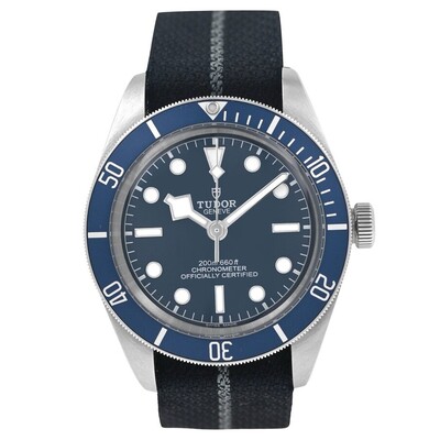 Silver-tone stainless steel case with a blue fabric strap. Uni-directional rotating blue stainless steel bezel. Blue dial with silver-tone hands and index hour markers. Minute markers around the outer rim. Dial Type: Analog. Luminescent hands and markers. Tudor Calibre MT5402 Automatic movement, containing 27 Jewels, bitting at 28800 vph, and has a power reserve of approximately 70 hours. Scratch resistant sapphire crystal. Screw down crown. Solid case back. Round case shape, case size: 39 mm. Buckle clasp. Water resistant at 200 meters / 660 feet. Functions: hour, minute, second, chronometer. Black Bay Fifty-eight Series. Casual watch style. Watch label: Swiss Made. Item Variations: 79030B-0003. Pre-owned Tudor Black Bay Fifty-Eight Automatic Chronometer Blue Dial Mens Watch 79030B.