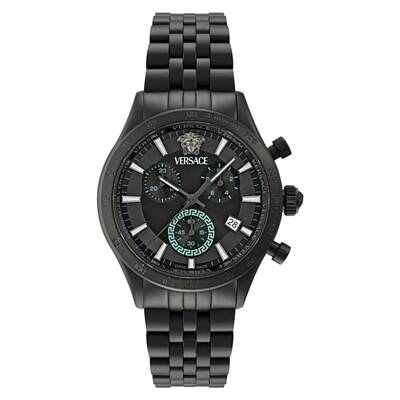 Black IP stainless steel case and bracelet. Fixed tachymeter scale black IP stainless steel bezel. Black dial with black hands and index hour markers. Minute markers around the outer rim. Dial Type: Analog. Luminescent hands and markers. Date display at the 4 o'clock position. Chronograph - three sub-dials displaying: 60 second, 30 minute and 12 hour. Quartz movement. Scratch resistant sapphire crystal. Pull / push crown. Solid case back. Round case shape, case size: 40 mm. Deployment with push button release clasp. Water resistant at 50 meters / 165 feet. Functions: chronograph, date, hour, minute, second. Hellenyium Series. Sport watch style. Watch label: Swiss Made. Versace Hellenyium Chronograph Quartz Black Dial Watch VECFA0624.