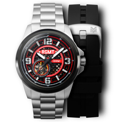 Clear, legible and fuss free. The Artillery series demonstrates a military inspired intelligence in design with restraint. Each watch however is still activated by a purpose and detail to make this an all weater, all style watch. Silver-tone stainless steel case and bracelet. Fixed black stainless steel bezel. Red dial with black hands and index hour markers. Minute markers around the outer rim. Dial Type: Analog. Luminescent hands and markers. Automatic movement. Scratch resistant sapphire crystal. Screw down crown. Solid case back. Round case shape, case size: 43 mm, case thickness: 14 mm. Band width: 22 mm, band length: 8 inches. Fold over clasp with a safety release. Water resistant at 100 meters / 330 feet. Functions: hour, minute, second. Artillery Series. Casual watch style. RGMT Artillery Automatic Red Dial Mens Watch RG-8029-55.