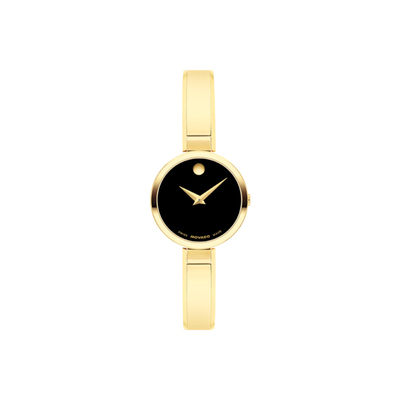 Yellow gold-tone stainless steel case and bracelet. Fixed yellow gold-tone stainless steel bezel. Black dial with yellow gold-tone hands. Dial Type: Analog. Quartz movement. Round case shape, case size: 24 mm. Fold over clasp with a safety release. Functions: hour, minute. Moda Series. Luxury watch style. Watch label: Swiss Made. Movado Moda Quartz Black Dial Ladies Watch 0608013.