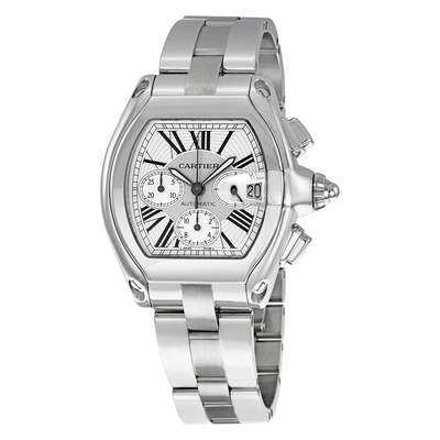 Silver-tone stainless steel case and bracelet. Fixed silver-tone stainless steel bezel. Silver dial with luminous hands and Roman numeral hour markers. Minute markers around the outer rim. Dial Type: Analog. Luminescent hands and dial markers. Magnified date display at the 3 o'clock position. Chronograph - three sub-dials displaying: 60 second, 30 minute and 12 hour. Cartier Calibre 8510 automatic movement with a 42-hour power reserve. Scratch resistant sapphire crystal. Screw down crown. Stainless steel case back. Tonneau case shape, case size: 49 mm x 43 mm, case thickness: 12.2 mm. Band width: 20 mm. Hidden deployment clasp. Water resistant at 100 meters / 330 feet. Functions: hours, minutes, seconds, date, chronograph. Additional Info: . suitable for snorkeling, as well as swimming, but not diving. Roadster Series. Luxury watch style. Watch label: Swiss Made. Pre-owned Cartier Roadster Chronograph Silver Dial Mens Watch W62019X6.