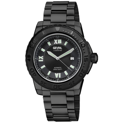 Black stainless steel case and bracelet. Uni-directional rotating black stainless steel bezel. Black dial with silver-tone hands and Roman numeral & index hour markers. Minute markers around the outer rim. Dial Type: Analog. Luminescent hands and markers. Date display at the 3 o'clock position. Catena SA110 automatic movement. Scratch resistant sapphire crystal. Screw down crown. Transparent case back. Round case shape, case size: 44 mm, case thickness: 14 mm. Band width: 22 mm, band length: 8.5 inches. Deployment with push button release clasp. Water resistant at 200 meters / 660 feet. Functions: date, hour, minute, second. Seacloud Series. Luxury watch style. Watch label: Swiss Made. Gevril Seacloud Automatic Black Dial Mens Watch 31229B.